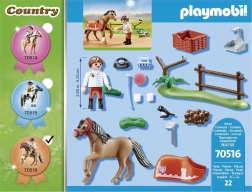 Ez a részletgazdagon kidolgozott szett a Playmobil Country sorozatból egy fiú és szeretett Connemara pónija történetét hozza el. A gyerekek élvezhetik a napi lógondozást – a kellékek elpakolását a piros dobozba, a takaró felterítését és az istálló rendbetételét.