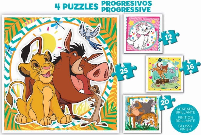 Fedezze fel a szórakoztató puzzle szettet a kedvelt Disney állatkákkal. A fokozatosan növekvő nehézségnek köszönhetően a gyerekek fejlesztik finommotorikájukat, türelmüket és logikus gondolkodásukat. Minden kép eltérő darabszámú, így a kicsik a legegyszerűbbtől a bonyolultabbig próbálhatják ki az építést.