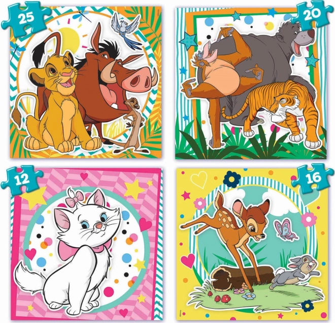 Aranyos gyermek puzzle Disney mesék motívumaival, négy kirakó egy készletben. A progresszív nehézségi szint (12, 16, 20 és 25 darab) segít a gyerekeknek lépésről lépésre fejleszteni készségeiket. A csomag része egy praktikus műanyag bőrönd a könnyű hordozáshoz és tároláshoz. Minden kirakott puzzle mérete kb. 16 × 16 cm.