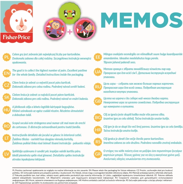 A Pexeso Állatkák Fisher-Price ideális választás a szórakozáshoz és a gyerekek fejlődéséhez. Az állatos motívumokkal nemcsak a gyerekek szórakoznak, hanem memória képességeiket is gyakorolhatják. A játék úgy lett tervezve, hogy megfeleljen a legkisebb játékosok igényeinek.