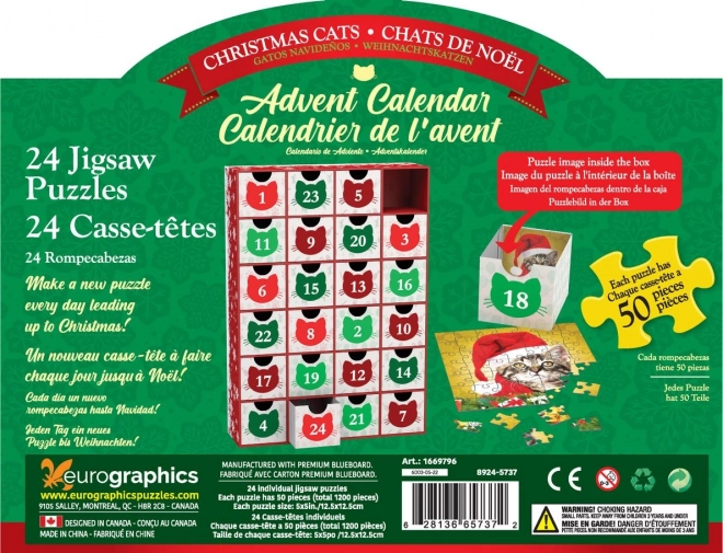 EUROGRAPHICS adventi naptár 24 mini kirakóval: Karácsonyi cicák. Minden kirakó 50 darabos, 12,5 × 12,5 cm. Újrahasználható fiókok mintaképekkel.