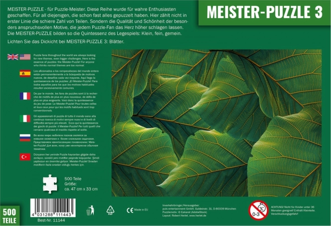 Élvezze a kihívást jelentő kirakást a Meister-Puzzle sorozat harmadik motívumával – levelek. 500 darab és a kompakt 47 × 33 cm-es méret örömet szerez mindenkinek, aki valódi kihívást keres, és szeretné képességeit magasabb szintre emelni.