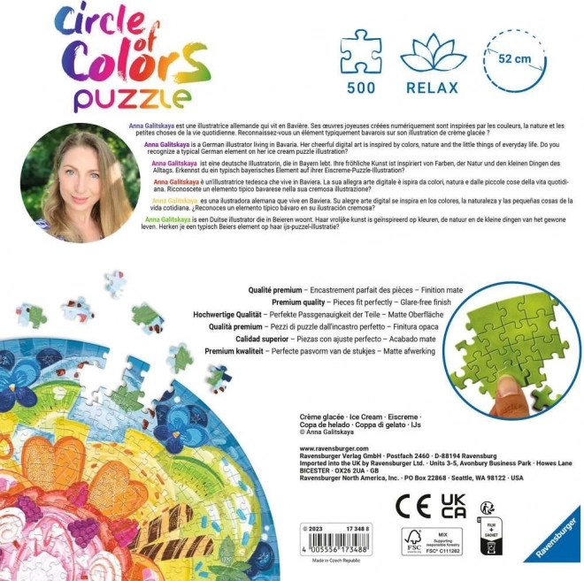 Ravensburger Puzzle Fagylalt 500 darabot kínál, amelyek elbűvölik minőségükkel és színeikkel. Fiúk és lányok számára 12 éves kortól alkalmas, garantálva órákon át tartó szórakozást és kognitív fejlődést biztosít.