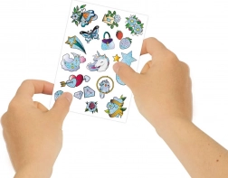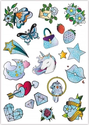 A Crazy Chic Csillogó Tetoválások készlet széles körű designokat tartalmaz, beleértve az unikornisokat, pillangókat és további motívumokat. A tetoválások könnyen alkalmazhatók és bőrgyógyászatilag teszteltek.