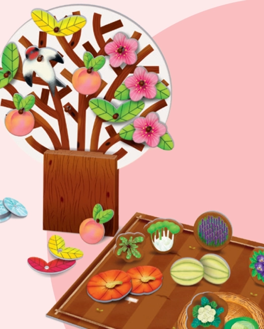 Színes és eltávolítható elemek, mint a levelek, virágok és gyümölcsök lehetővé teszik a kreatív játékot.