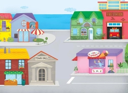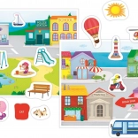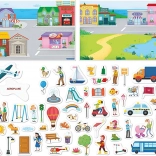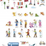 Két gazdagon illusztrált jelenet támogatja a történetmesélést és a szókincs gyakorlását helyszínekkel, foglalkozásokkal, közlekedéssel és állatokkal kapcsolatban.