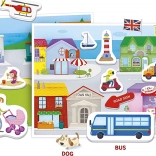 A gyerekek képeket párosítanak különböző környezetekhez, és természetes módon sajátítanak el több mint 50 angol szót – a háztartási tárgyaktól a városi helyszínekig.