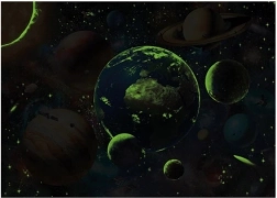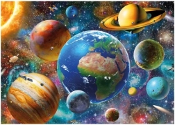 A neon puzzle darabok gyönyörű bolygóképet fednek fel, részletes elemekkel, beleértve a Szaturnuszt és a Földet.