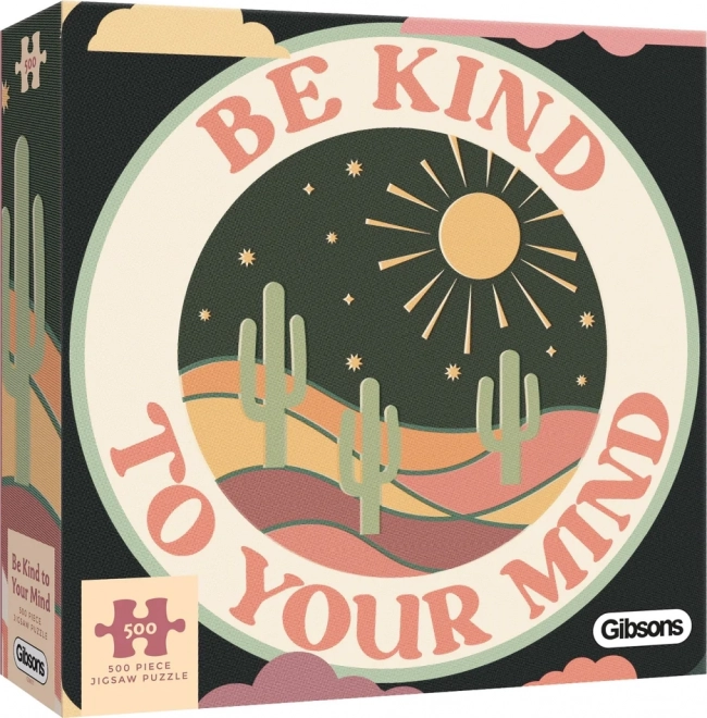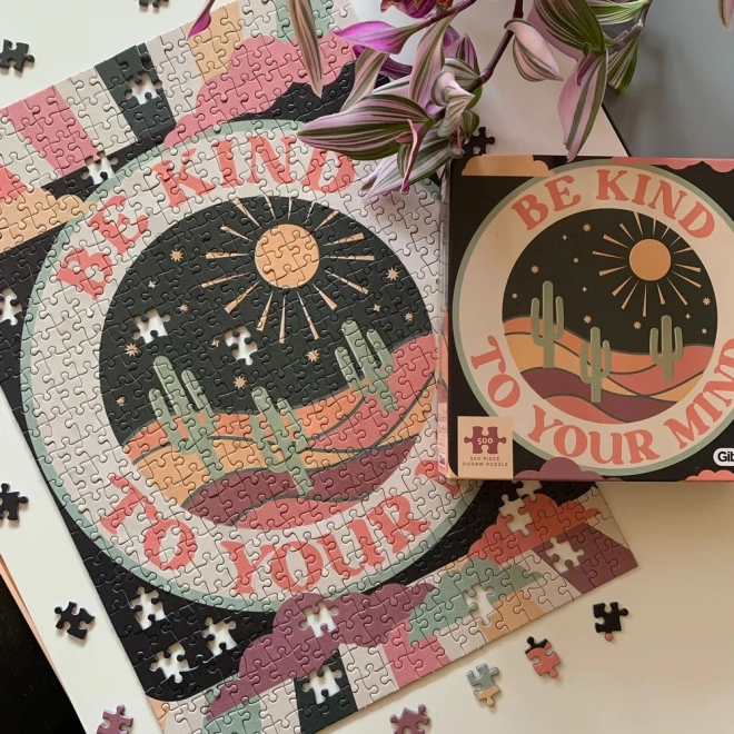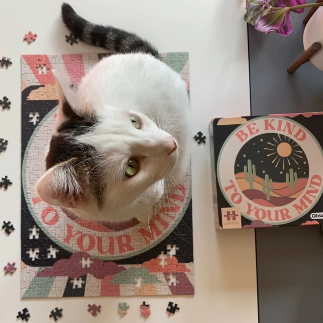 Modern puzzle design a "Legyen kedves az elméjéhez" motívummal, ideális azok számára, akik el akarnak menekülni a hagyományos motívumok elől, és friss stílust akarnak hozni otthonukba.