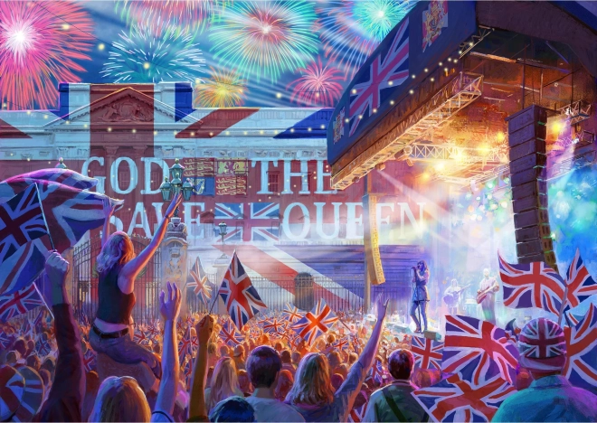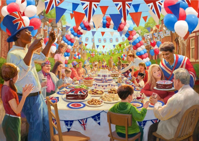 Fedezd fel a Nagy-Britanniát ünneplő, 4 önálló puzzle-ből álló szettet: az Epsom Downs Derbyt, egy koncertet a palotánál, a királyi hintó felvonulását a Trooping the Colour során és egy pezsgő utcai ünnepséget. Mindegyik puzzle 500 darabos, összeállítva kb. 49 × 34 cm; a csomagban motívum-útmutatók is találhatók.