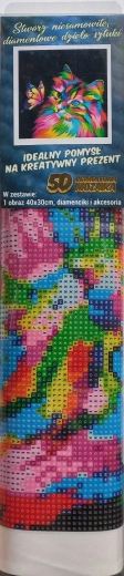 Gyémántfestés – útmutató: A vászon felső oldala ragasztóval van bevonva és átlátszó fóliával fedett. A fóliát fokozatosan, részenként távolítsd el, ahogy a köveket felhelyezed. Ha a fóliát egyszerre teljesen leveszed, a ragasztóréteg elszennyeződhet, és a kövek nem tapadnak olyan jól. A vásznon jelölések találhatók, amelyek a mellékelt legendában szerepelnek, és a megfelelő, számmal jelölt kőtasakokra utalnak. Az adott tasakból szórd ki a köveket a tálcába. A toll hegyébe vegyél fel egy kis viaszt, így a kövek könnyen rátapadnak a tollra. A köveket a tollal helyezd fel a képre. Az adott szín felragasztása után a köveket szórd vissza a tasakba, és folytasd a következő színnel.