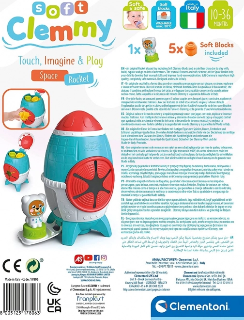 Ez a színes Soft CLEMMY doboz űrrakéta dizájnnal 10–36 hónapos gyerekeknek kínál biztonságos és ösztönző környezetet az első építésekhez és felfedezéshez. A puha kockák kellemes tapintásúak, könnyen nyomhatók, és a texturált felületeknek köszönhetően nagyszerűen stimulálják a tapintást. A maci űrhajós figura a kockákra helyezhető, és bevonható a kreatív és témájú játékba.