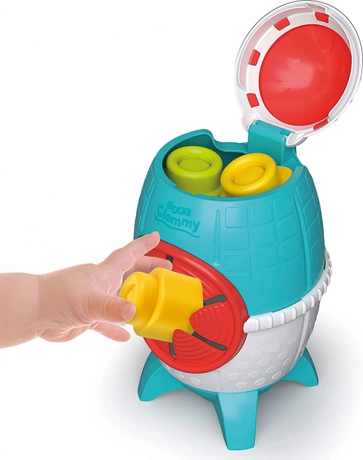 A fedéllel és oldalsó nyílással ellátott rakéta dizájn okos játék és praktikus tároló egyben. A gyerekek gyakorolják a bedobást, kihúzást és a kéz–szem koordinációt.