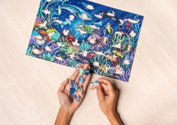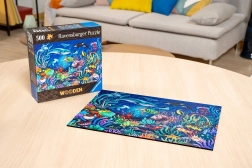 Szánjon időt magára, és merüljön el az óceán lenyűgöző motívumában, tele halakkal, korallokkal és tengeri élőlényekkel. Az 500 darabos fa puzzle a minőségi kivitelezést, az elegáns dizájnt és az átgondolt szórakozást ötvözi az egész család számára. A precízen kivágott formáknak, köztük a állatokat és növényeket idéző daraboknak köszönhetően az összerakás ötletes és magával ragadó.