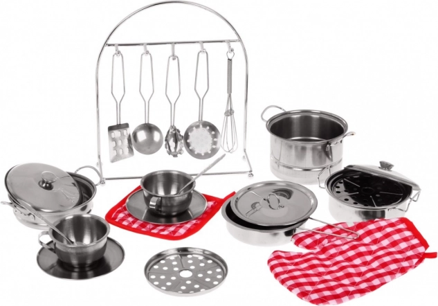 A készlet különféle fém fazekakat, serpenyőket és edényeket tartalmaz az autentikus játékélményért. A gyermek élvezheti a játékot a valódi konyhai eszközökkel.