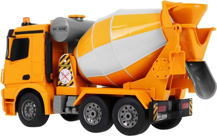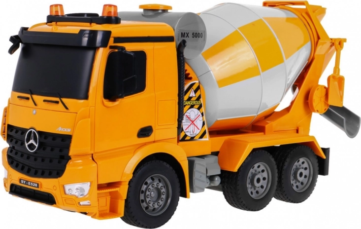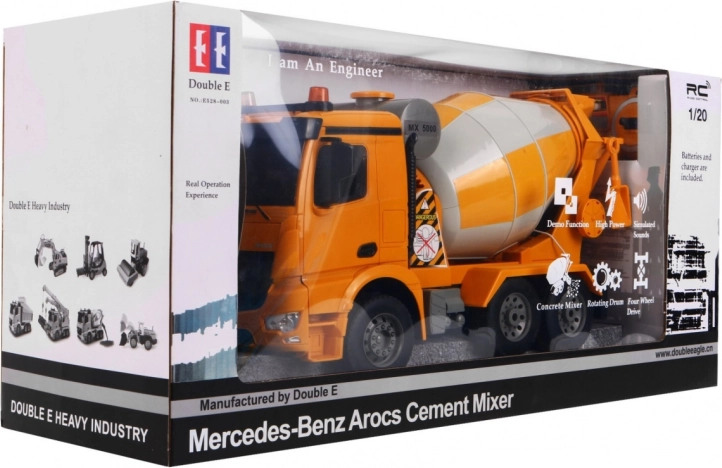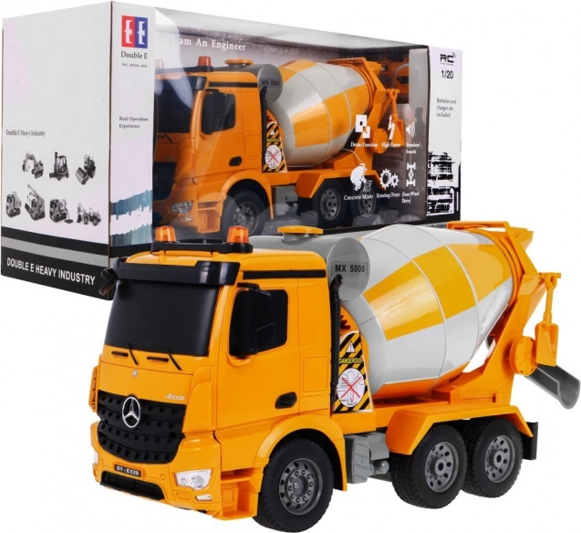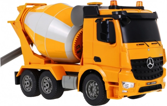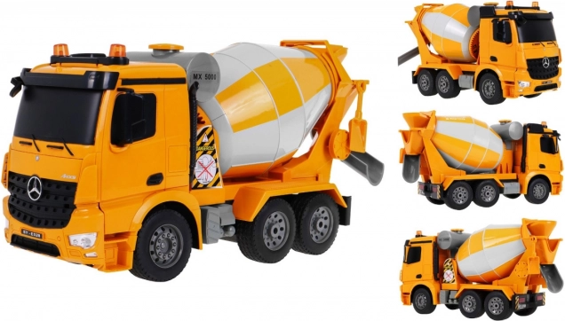 Fedezd fel a Mercedes-Benz Arocs betonkeverőt, egy lenyűgöző építőipari járművet 1:20 méretarányban, amely tökéletes választás a 6 éves vagy idősebb gyerekek számára!