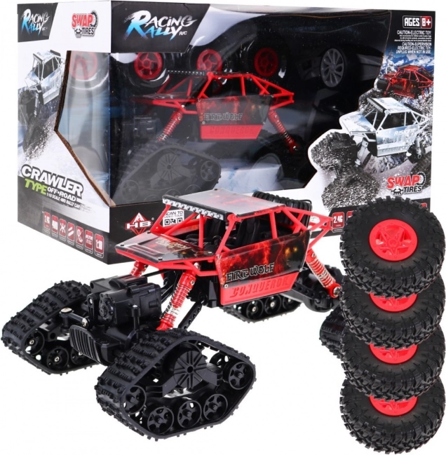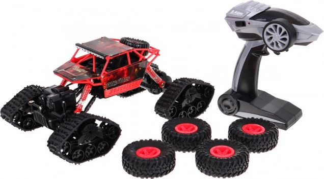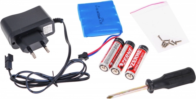 - RC terepjáró autó, távirányító, akkumulátor, töltő, 3× AA elem, 4 gumikerék, 4 gumilánctalp, csavarhúzó, pótcsavar-készlet, díszdoboz