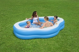Élvezze a nyarat a tágas BESTWAY családi medencével, amely integrált felfújható üléseket, italtartókat és átlátszó ablakot kínál a még több szórakozásért és kényelemért. Tartós vinil, stabil szerkezet és egyszerű felfújás/összecsukás teszi ideális kerti medencévé gyermekek és felnőttek számára egyaránt.