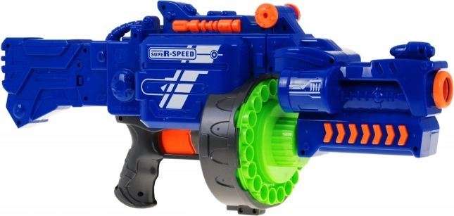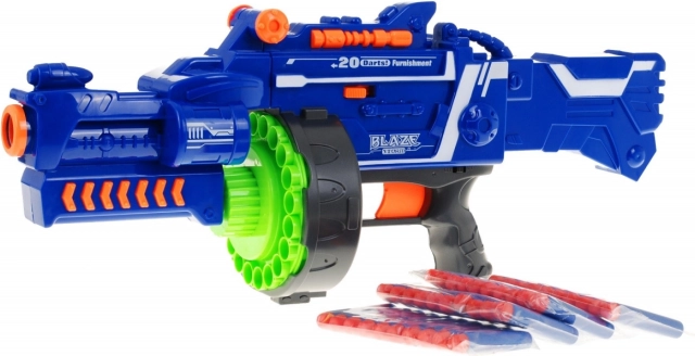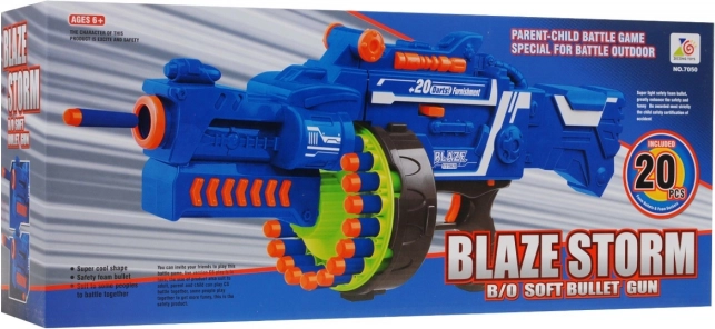A félautomata BLAZE STORM blaster dinamikus, mégis biztonságos szórakozást kínál kicsiknek és nagyoknak. Az 5 darab AA elemmel működő elektromos kompresszor másodpercenként akár 3 lövedéket lő ki, a dobtár 20 lövedéket fogad, a hatótáv pedig hozzávetőleg 10 méter. Az ON/OFF elsütőbillentyű-biztosítéknak és az elakadásvédelemnek köszönhetően a játék folyamatos és gondtalan. Két stabilizáló görgő a csőben pontosabb lövéseket segít, a lehajtható válltámasz pedig megkönnyíti a töltést és a kezelést.