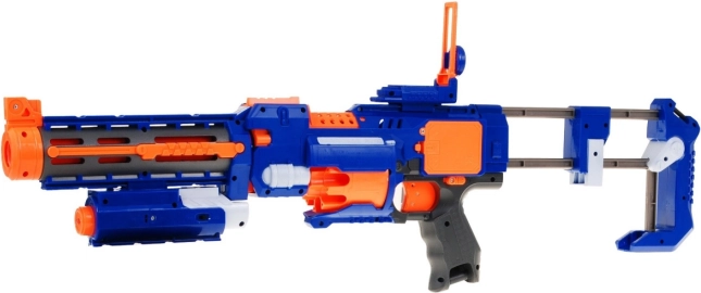 A hosszú csőben lévő stabilizáló görgők pontosabb röppályát segítenek, míg a csúsztatható szervizablak megkönnyíti a beragadt lövedék eltávolítását. Van ON/OFF kapcsoló a ravasz biztonságos blokkolásához, elülső betöltés és egy praktikus lézeres irányzék a jobb célzáshoz. A dobozban 20 szivacslövedéket talál, így azonnal kezdődhet a játék.