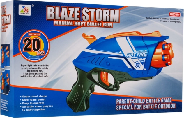 Szórakoztató és biztonságos gyerek pisztoly, a BLAZE STORM Hot Fire, kézi rugós mechanizmussal az egyes lövésekhez. Könnyű elülső töltés, akár 10 m hatótáv, a csomagban pedig 20 habnyíl található. A kompakt, ergonomikus kialakítás 6 éves kortól ideális.