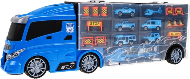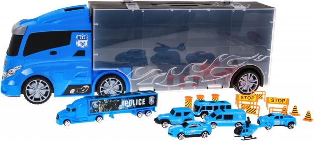 Fedezze fel a multifunkciós rendőrségi kamiont, amely egyszerre praktikus rendező a kisautóknak és szuper játékszett. Oldalt két nyitható tároló található – az egyik oldalon 13 kisebb rekesz, a másikon 5 nagyobb. A fülke felett van a csúszda bejárata, amely a fülkén át vezet és az autó elejénél ér véget. A kamion felső felülete helikopter „leszállópályájaként” szolgál. A kényelmes fogantyúnak köszönhetően a gyerekek bárhová magukkal vihetik a szettet.