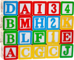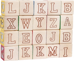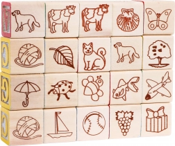 A készlet 20 fa kockát tartalmaz betűkkel és képekkel, amelyek segítik a gyerekeket az ábécé elsajátításában és a kreativitás fejlesztésében.