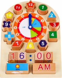 Ez a fa órakészlet segít gyermekének könnyen megtanulni felismerni az időt, napszakot, időjárást és hónapokat. Két mozgatható mutatót tartalmaz, amelyek szabadon beállíthatók különböző időpontokra. Gyermeke azonnal feljegyezheti az időt a számos kockával, és felismerheti a napszakot, hogy napos, felhős, esős vagy havas az idő. A számos kockák különböző formájúak, amelyeket helyesen kell elhelyezni a táblán.