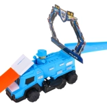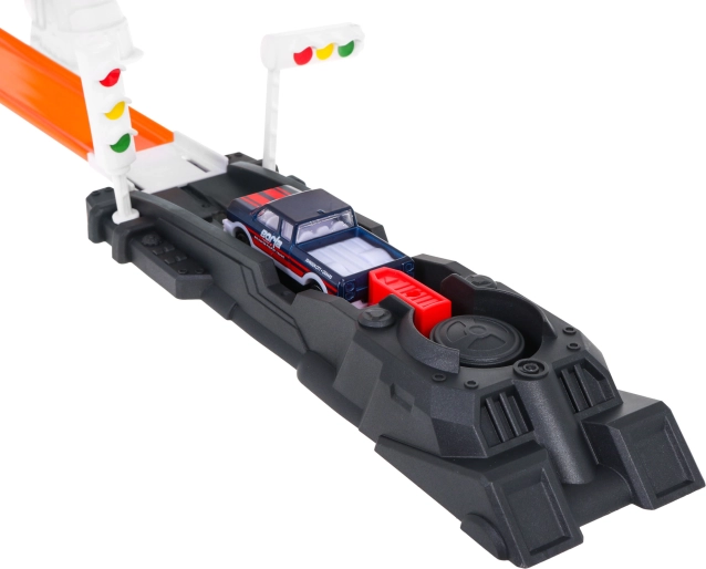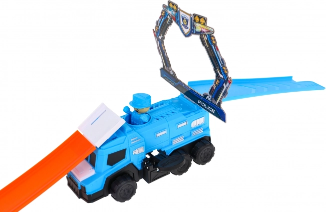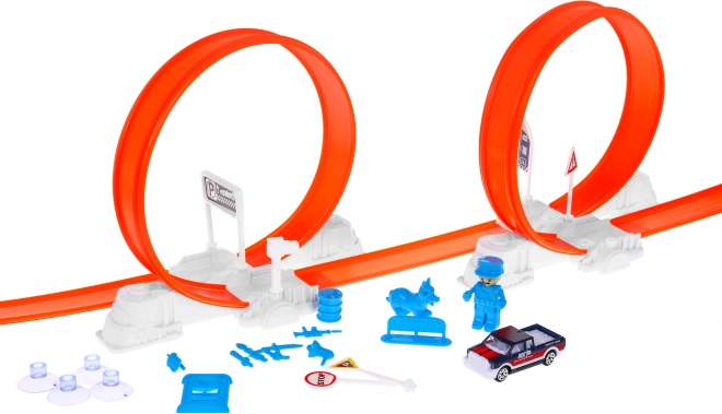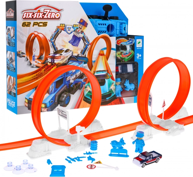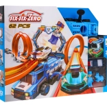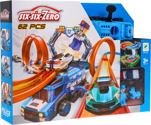 Építsd meg saját adrenalindús pályádat rendőrségi témával, és küldd az autókat két nagy hurokba teljes 360°-os fordulattal. Az erős kilövő biztosítja a szükséges sebességet, a nagy rendőrségi vontatókamion pedig minden üldözés központi eleme lesz. A speciális kisautó vízbe mártva színt vált, így minden futam új effektusokat és történeteket hoz.
