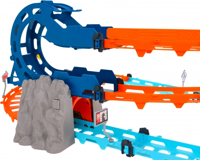 Vágjon bele egy gyors menetbe a többszintes pályán, amely tele van hurkokkal, kanyarokkal és kaszkadőr elemekkel. A pálya könnyű összeszerelésre készült, fejleszti az ügyességet és a képzelőerőt, és a megvilágított, hangos alagútnak köszönhetően hiteles versenyhangulatot nyújt a gyerekeknek.