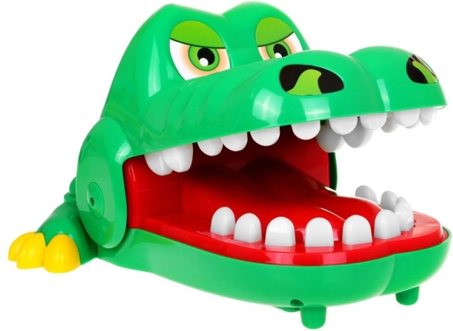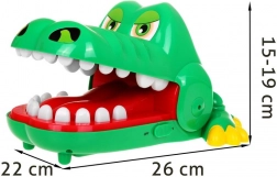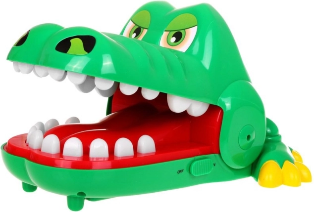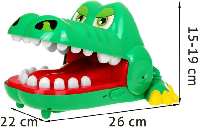 | A krokodil bátran kinyitja a száját, és egy sor szép, egyenes fogat látunk, sajnos közöttük van egy fájós is. Ehhez sorban bármelyik fogra rányomjuk az ujjunkat (több játékos esetén egymás után). 3 JÁTÉKVARIÁCIÓ: 1. FÁJÓ FOG - piros gomb – az első játékmód aktiválása. - a gomb megnyomása után indítjuk a játékot: egymás után nyomogatjuk a fogakat... Ha eltalálod a fájó fogat, a krokodil megharap! Ez vereséget jelent. 2. REFLEXJÁTÉK: - nyomd meg a fogat, amely narancssárga fénnyel világít, - gyorsan nyomd meg a sorban felvillanó fogakat, a felvillanás sebessége fokozatosan nő, - ha két fog világít egyszerre, próbáld meg őket a lehető leggyorsabban egymás után megnyomni, - ha háromszor hibázol, a krokodil becsukja a száját, vesztettél, a játék véget ér. - a játék végén a világító fogak száma a reflexszintednek fog megfelelni. 3) MEMÓRIA: - nyomd meg a zölden világító fogat, - jegyezd meg a világító fogakat, - amikor a krokodil megkérdezi: „Melyik fog fáj?”, nyomd meg a megjegyzett fogakat, - újra próbálkozhatsz, ha a válaszod helyes, - a világító fogak száma nőni fog, és a világítás ideje folyamatosan rövidül. - ha rosszul válaszolsz, a krokodil szája becsukódik, és az ujjadba harap. | ||