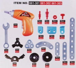 A készlet része egy műanyag elektromos csavarhúzó és egy villáskulcs, amelyekkel a gyerekek bekapcsolhatják mechanikus teremtményeiket.