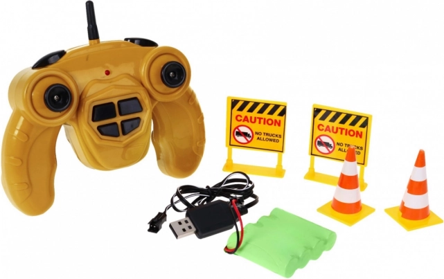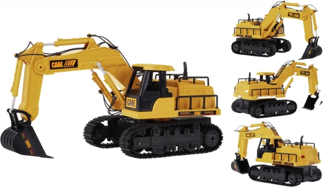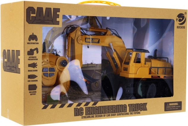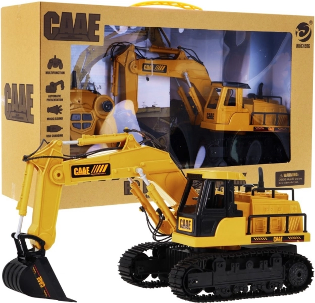 | | A kotrógép minden kis építő álma. Masszív kivitel, élénk színek, minőségi műanyag. A jármű előre és hátra halad, jobbra és balra kanyarodik. Menet közben hallható a gép hangja. Hátramenetben visszajelző hang hallható. A kotrógép forgatható felépítménye és karja (360 fok) ás, fel-le mozog, távirányítóval vezérelhető. Kürt hang, vidám zene. A markoló 2,4 GHZ frekvencián működik. A játék 3 éves kortól ajánlott, CE tanúsítvánnyal rendelkezik. Környezetbarát, bőrönd típusú csomagolás hordfogantyúval. | A készlet tartalma | - Kotrógép (4,8 V típusú akkumulátorral működik – a csomag tartalmazza), - távirányító (2 x AA típusú elemmel működik – nem tartozék), - USB kábel, - 2x figyelmeztető tábla, - 2x bója. | Méretek | |