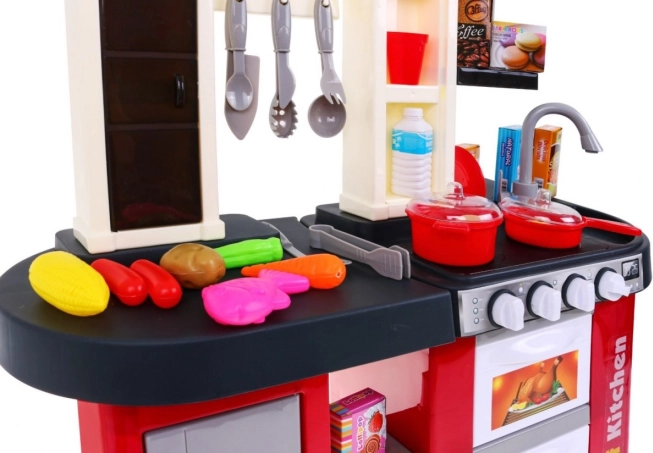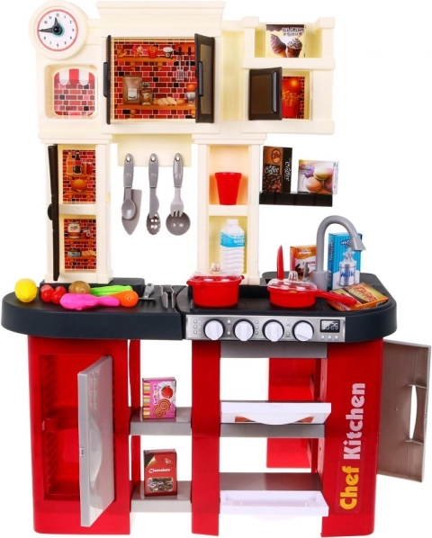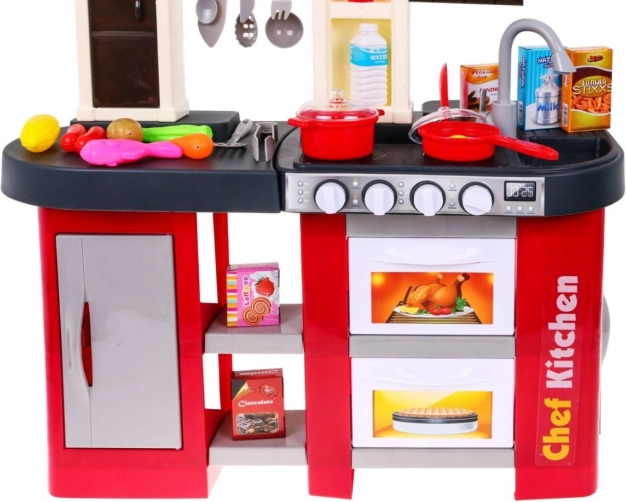 Ez a tágas, műanyag játékkonyha piros-fekete dizájnnal 3 éves kortól nyújt hiteles főzési élményt. A gombok elfordítása után életre kelő fényhatások és a főzés, sütés hangjai támogatják a kreatív játékot és a finommotorika fejlődését. A szórakozást a működő vízcsap is új szintre emeli.