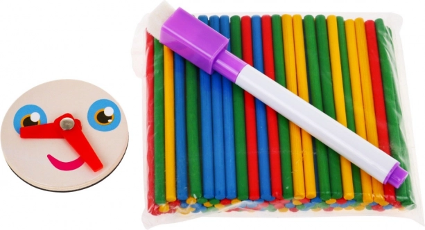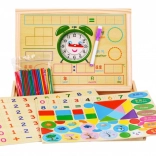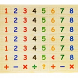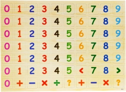 - Fadoboz alján szorzótáblával; mágneses számkártyák; mágneses műveletkártyák (+, −, ×, ÷, >, <, =, ?); színes mágneses formák; mágneses korongok időjárással, évszakokkal és a hét napjaival; mágneses óra; kétoldalas mágneses tábla; színes fa számoló pálcikák; képes útmutató; törölhető filc mágnessel