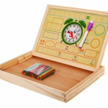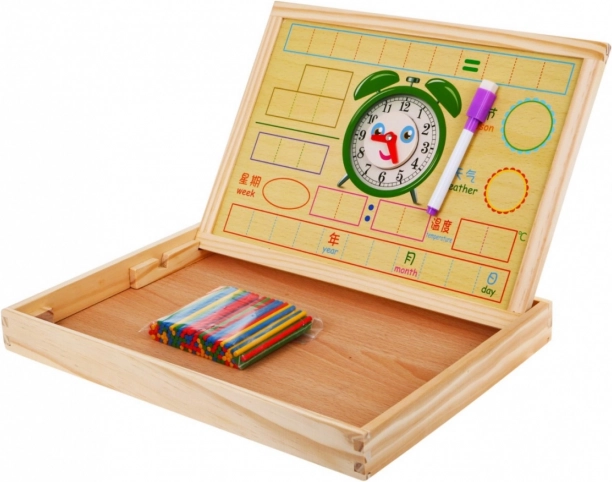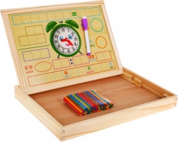 Fedezd fel a játékos tanulást ezzel a fából készült mágneses táblával 3 éves kortól. A gazdagon felszerelt oktató készlet fejleszti a logikát, a kreativitást és a finommotorikát. A mágneses szám- és műveletkártyák, figurák, a időjárás- és évszakpiktogramok, valamint a mágneses óra segítségével a gyerekek játékosan gyakorolják a számolást, az időt és az alakzatokat. A csomag része az kétoldalas mágneses tábla, egy törölhető filc és fából készült számoló pálcikák a könnyű és tartós, játékos tanuláshoz.