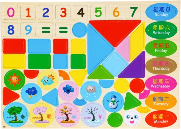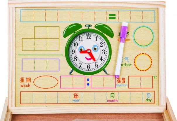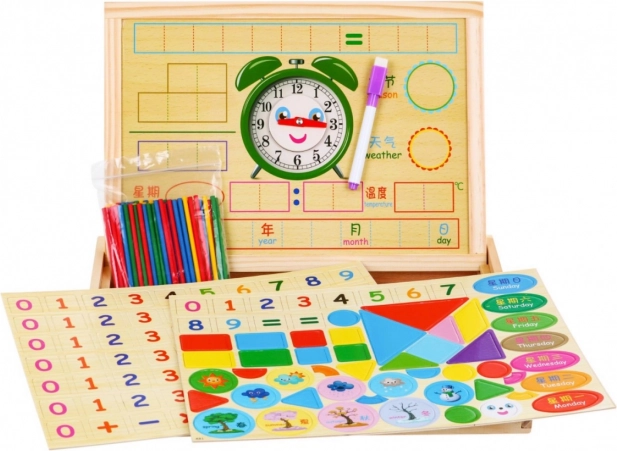 Ez a minőségi fa készlet úgy lett megtervezve, hogy változatos tanulási és szórakozási lehetőséget kínáljon a gyerekeknek. Segít megismerkedni a számokkal, az összeadással, kivonással, szorzással és osztással, a mágneses órának köszönhetően megtanítja az időben való tájékozódást, valamint a formák, a hét napjai, az időjárás és az évszakok felismerését. A kétoldalas mágneses tábla és a törölhető filc támogatja az ismételt gyakorlást rendetlenség nélkül.