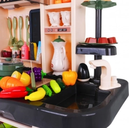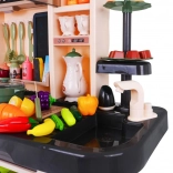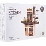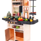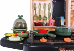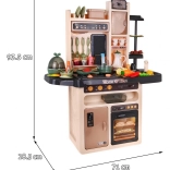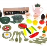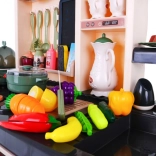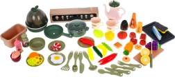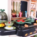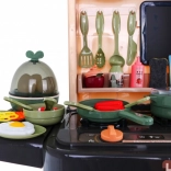 A gyermek konyha 65 darabos kiegészítőkkel érkezik: főzőlapok effektekkel, lábasok, serpenyők és különféle műanyag élelmiszerek, mint például tojás és zöldség.
