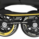 A cipőt hatékony szellőzés, félig áteresztő membrán és formázott talpbetét egészíti ki puha EVA habbal, bársonyos Velvet borítással. A hármas rögzítés (fűzés, tépőzáras pánt, biztosítós csat) stabilan tartja a lábfejet. Az alumínium váz PU kerekekkel 70×24 mm, 85A keménységgel és ABEC-7 csapágyakkal egyenletes és gyors haladást ad, a jobb cipő fékkel felszerelt.