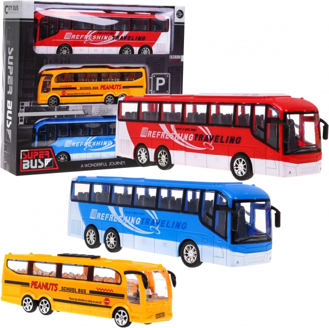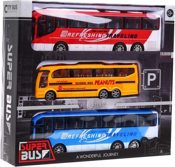A három buszból álló készlet, amely minden kis járműrajongót elbűvöl, a következőket tartalmazza: