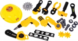 | - Gumipántos sisak kb. 19,5 cm x 16 cm, - csavarhúzó kb. 8 cm x 10 cm, - kalapács kb. 14 cm x 7,5 cm, - 3 x villáskulcs kb. 15 cm x 5 cm, - satu kb. 15 cm x 5 cm, - satu kb. 13 cm x 6 cm, - 2 x kisebb fogaskerék kb. 5 cm, - nagyobb fogaskerék kb. 8 cm, - 4 x csavar kb. 5 cm x 2,5 cm, - 4 x kupak, - matricák. | |