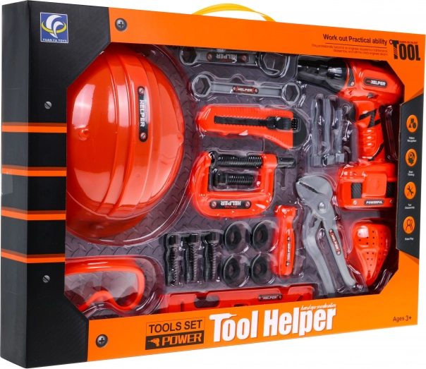 - csavarozó, gumipántos sisak, gumipántos védőszemüveg, vízmérték, csavarsatu, törhető pengéjű kés, villáskulcs, állítható (francia) kulcs, állítható fogó, hegesztőmaszk gumipánttal, dugóhúzó csavarhúzó, 4× csavar, 4× anya, fúró, lapos és kereszt bit.