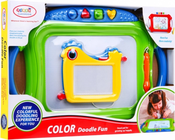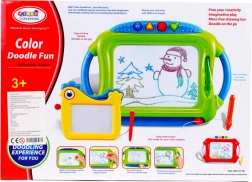 A készlet egy nagy, többszínű rajzhatással rendelkező mágneses táblát négy bélyegzővel, valamint egy kisebb, egyszínű rajzfelületű táblát tartalmaz. Mindkét táblán a vonalzó zsinóron rögzített, így nem vész el, és praktikus csúszka szolgál a gyors törléshez.