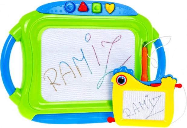 Nagy mágneses rajztábla vonalzóval és 4 bélyegzővel; kis mágneses rajztábla vonalzóval