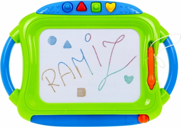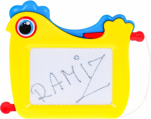 A kisebb mágneses tábla vonalzóval ideális autóba vagy sétákhoz. Egyszínű rajzolás és oldalsó csúszka a gyors törléshez.