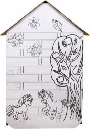 Fedezze fel a tágas, XXL méretű kartonházat, amelyet a gyerekek saját maguk szerelhetnek össze és díszíthetnek ízlésük szerint. A tiszta fehér felületeken fekete ló- és természetmotívumok ösztönöznek a színezésre ceruzákkal, filcekkel vagy zsírkrétákkal (a kiegészítők nem tartozékok).