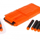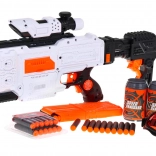 A doboz mindent tartalmaz, amire a játékhoz szükség van: 24 hablövedéket gumivégződéssel, 2 konzervdoboz alakú célpontot és védőszemüveget pánttal. A blasteren tolható kiadónyílás segít az elakadt lőszer könnyű eltávolításában, valamint állítható és levehető válltámasz gondoskodik a kényelmes fogásról.