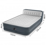 A beépített elektromos pumpa gyors és erőfeszítés nélküli felfújást és leeresztést tesz lehetővé. A kellemes velúr felület kíméletes a bőrhöz és javítja a lepedő tapadását. Az integrált felfújható háttámla támaszt nyújt olvasáshoz és pihenéshez. A csomag tartalma szállítótáska és javítófolt.