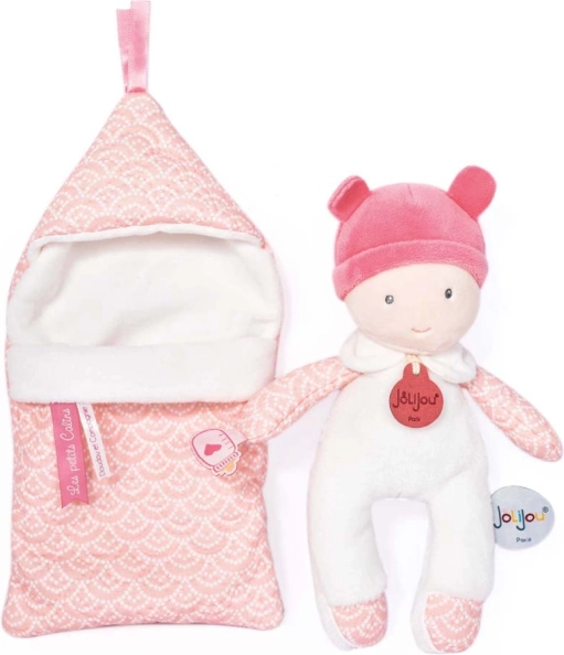 Aranyos plüss baba szép rózsaszín takaróban, tökéletes játék a születéstől kezdve. Puha textúrája révén a babának komfortot és biztonságot nyújt, így ideális társ alváshoz vagy játékhoz.