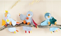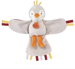 Ez a pihe-puha, harmonikus piros árnyalatokban készült zenélő madárka finom hangjával megnyugtatja a kicsiket, és számos ingerrel ösztönzi őket a felfedezésre. A susogó és texturált elemek, valamint a színes szalagok a szárnyakon, a farkon és a fejrészen támogatják az érzékelést és a finommotorikát.